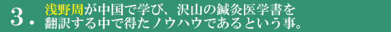 3、浅野周が中国で学び、沢山の鍼灸医学書を翻訳する中で得たノウハウであるという事。